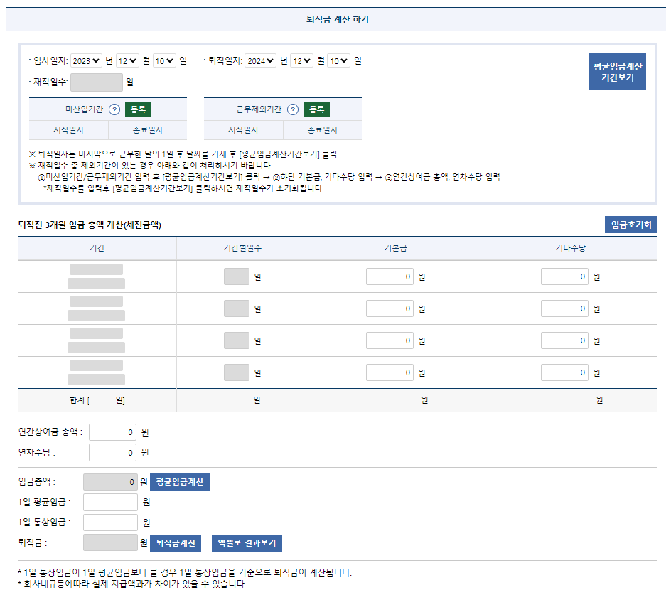 고용노동부 홈페이지에서 퇴직금 계산기 서비스를 제공하고 있어서 유용하게 사용하고 있습니다.