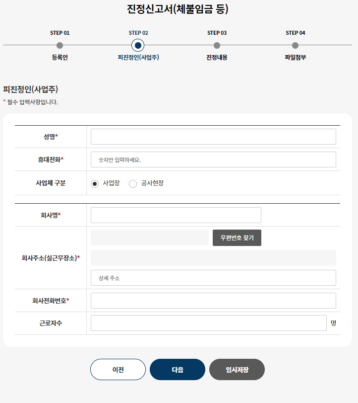 개인정보를 입력하고 -> 신고할 회사와 대표의 정보를 입력해주세요.