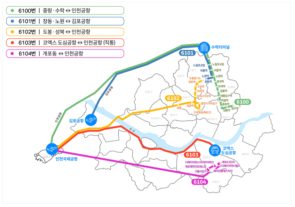 아래 표를 보시면 각 지역별로 공항가는 버스번호가 있고, 노선도&전체 시간표를 확인하실 수 있습니다.