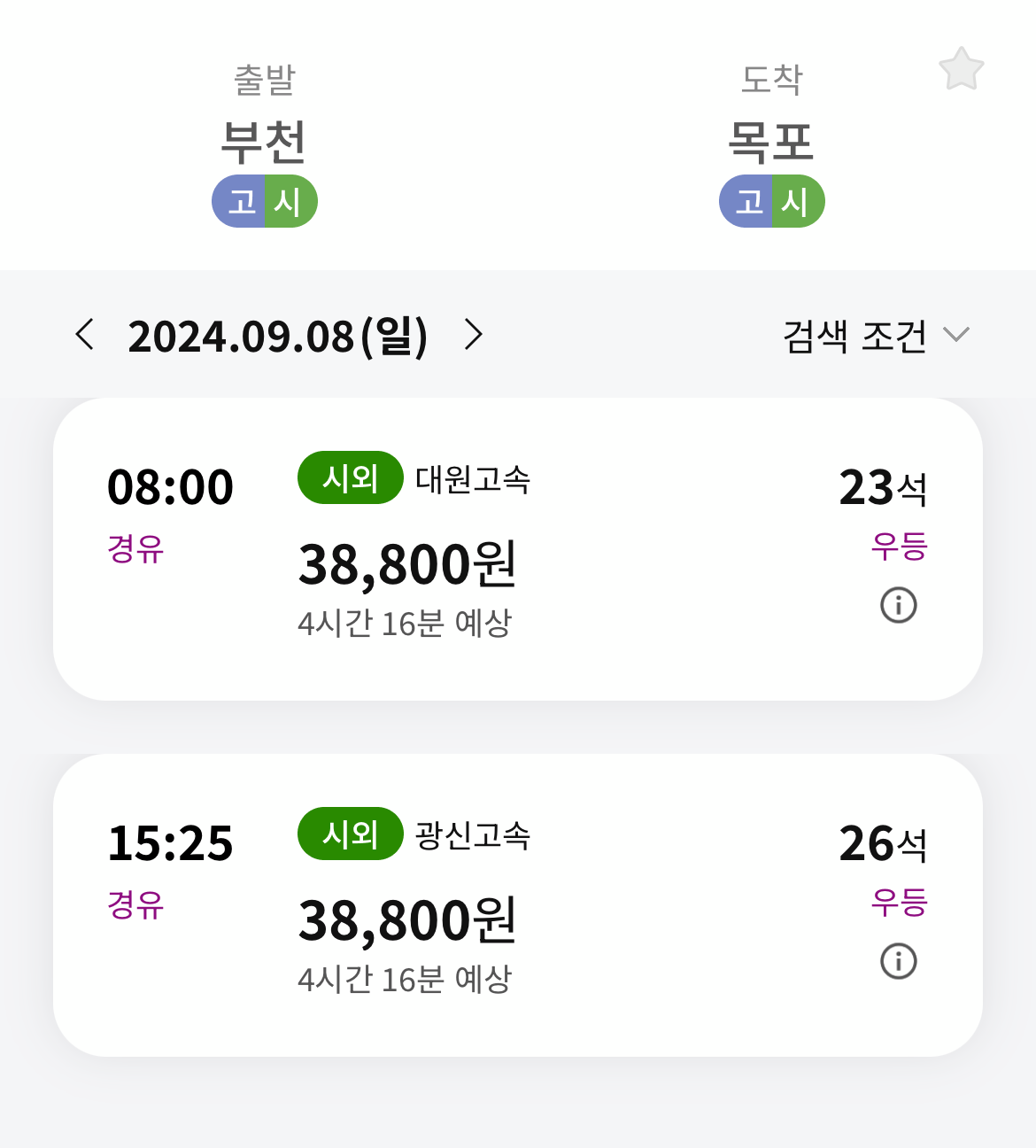 부천에서 목포 버스터미널 가는 버스 시간표는 하루 2타임 있습니다.