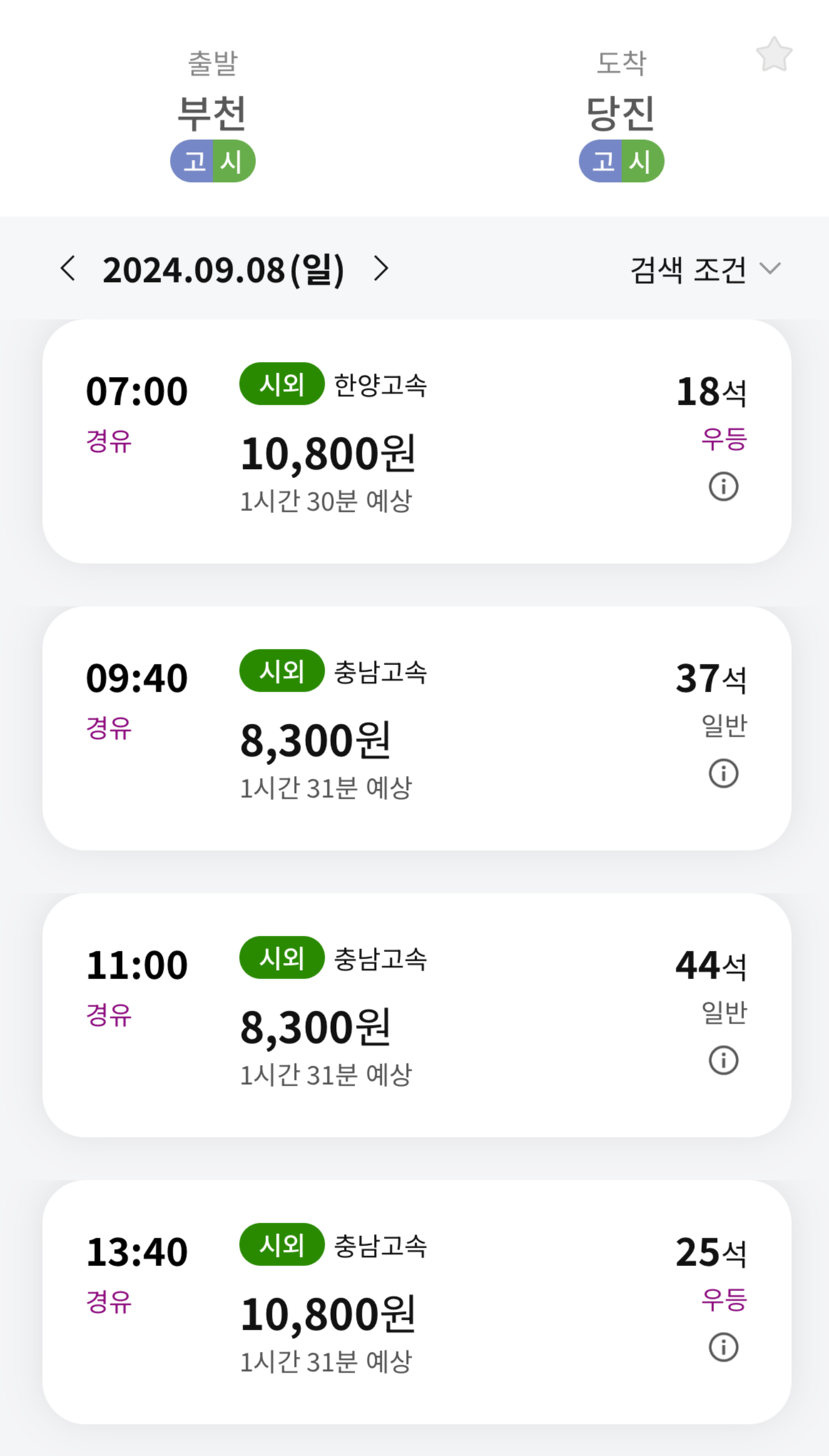 부천에서 당진 버스터미널 가는 버스 시간표는 하루 7타임 있습니다.
