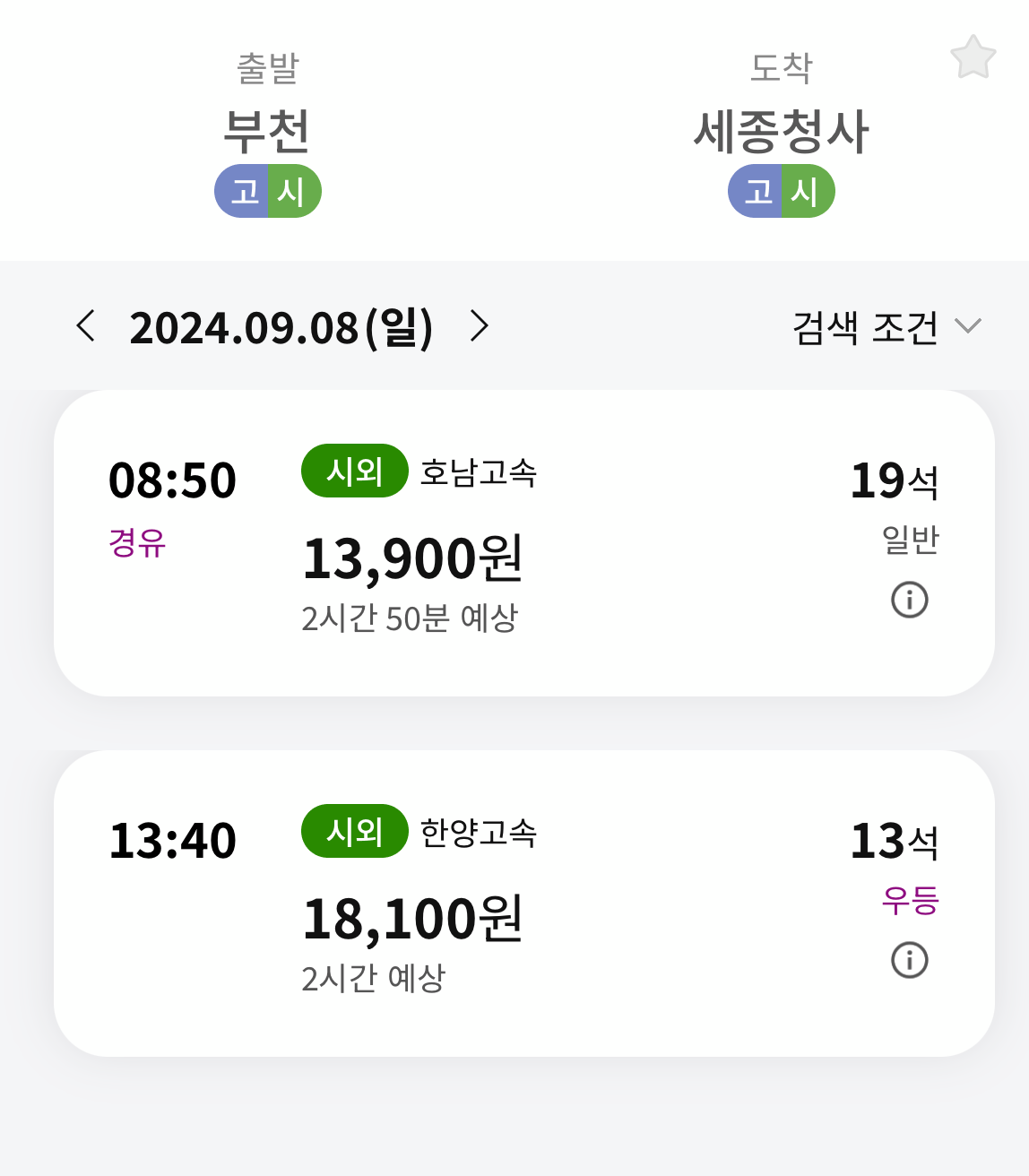 부천에서 세종 버스터미널 가는 버스 시간표는 하루 2타임 있습니다.