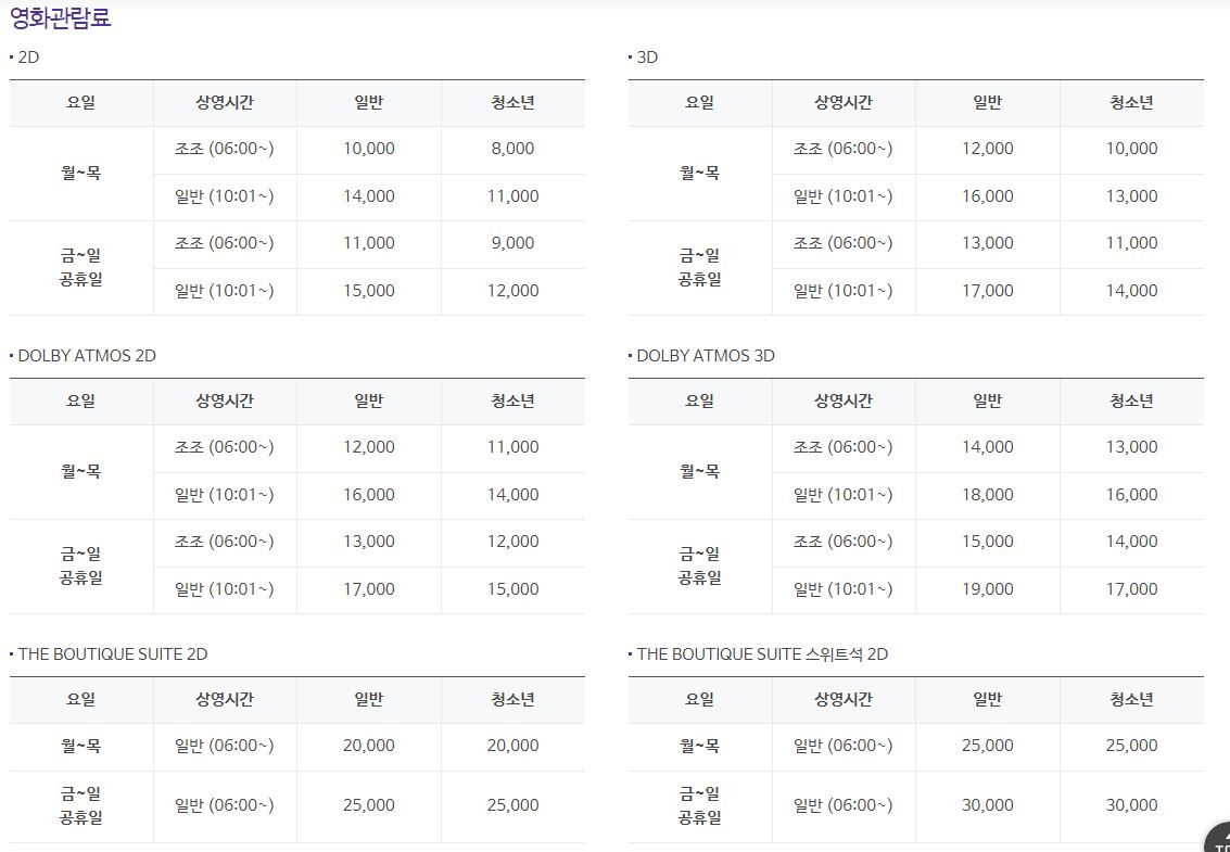 | 가 격 | 일반영화(2D) 7천원 입체영화(3D) 1만원 |